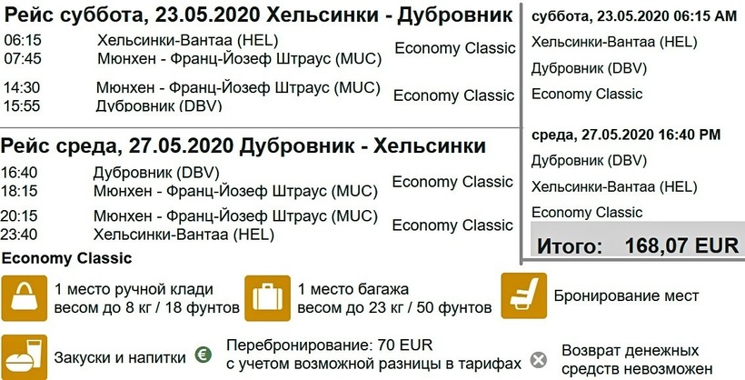 Finnair (AY 1831) Embraer 190 | 07:05 Хельсинки (HEL) | 3 ч. 05 мин | 09:10 Дубровник (DBV) | 3, 10, 17, 24 апреля |