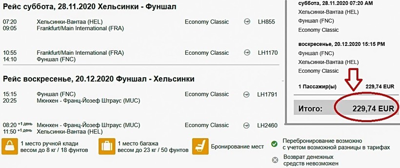 Авиасообщение между Хельсинки и столицей португальского острова Мадейры не могу назвать очень хорошо развитым, потому что прямые рейсы по направлению выполняются всего 1 раз в неделю. Беспересадочные перелеты осуществляет компания Finnair. Самолеты финского оператора летают по маршруту только по понедельникам. Авиарейс утренний, путешествие занимает около 6 часов. По данному направлению Finnair предлагает полет только в классе эконом, и авиабилеты у компании дорогие: в одну сторону обойдутся с багажом от 39000 ₽ (425 €), туда-обратно — от 63000 ₽ (685 €). Немного сэкономить у оператора можно, если лететь только с ручной кладью: авиапутешествие будет стоить от 36000 ₽ (395 €) и 58500 ₽ (640 €) соответственно. Цены у финского авиаперевозчика стабильны в течение года (действительны даже при покупке за 4–6 месяцев до вылета), но советую оформлять перелет заранее на летний сезон, так как на этот период билеты пользуются наибольшим спросом.