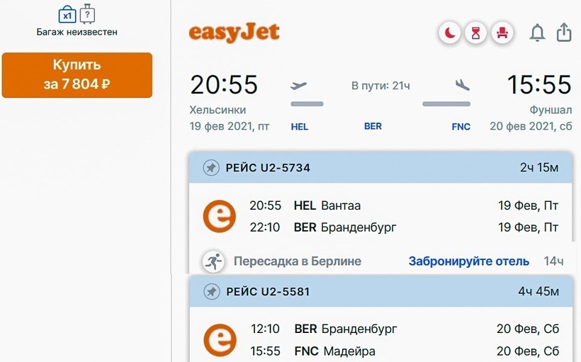 easyJet выполняет авиарейсы с ноября по апрель только по пятницам, в остальное время года — еще и по вторникам. Полет с данной компанией довольно длительный: включая стыковку в Берлине в 13,5–17,5 часа, путешествие занимает 20,5–24,5 ч. Пересадка ночная, поэтому придется дополнительно оплачивать проживание в гостинице. Главное преимущество лоукостера — дешевые билеты с ручной кладью: туда можно купить за 7500–11000 ₽ (80–120 €), туда-обратно — от 17000 ₽ (185 €). Но провоз багажа у easyJet довольно дорогой — за чемодан весом в 15 кг придется заплатить 5500 ₽. Бизнес-класс у оператора недоступен.