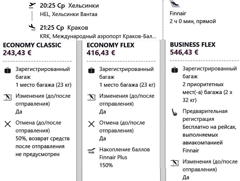 | Finnair (AY 1165) Airbus A321 | 19:10 Хельсинки (HEL) | 2 ч. 05 мин | 20:15 Краков (KRK) | 14 декабря |