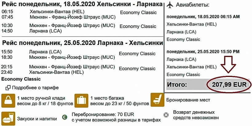 | Norwegian (D8 2974) Boeing 737 | 06:00 Хельсинки (HEL) | 4 ч. 25 мин | 10:25 Ларнака (LCA) | пт с 08.05 |