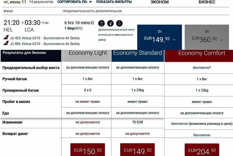 Кроме описанных операторов, с мая по сентябрь по четвергам могу посоветовать путешествие на крыльях Air Serbia. С часовой пересадкой в Белграде полет продлится 6 ч. Плюс сербского оператора в недорогих авиабилетах: в одну сторону можно купить с багажом от 12500 ₽ (150 €), туда-обратно — от 18500 ₽ (225 €). Бизнес-класс — от 30000 ₽ (360 €). Цены актуальны в течение всего сезона. Сэкономить на багаже не получится.