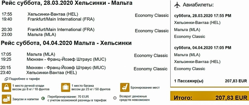 Стоимость авиабилетов на самолет Хельсинки — Мальта в одну сторону (“туда”) колеблется от 14 791 до 16 347 рублей, в среднем купить билет можно за 15 569 рублей.