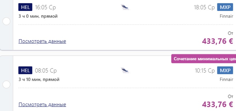 | Finnair (AY 7055) Airbus А320 | 17:10 Хельсинки (HEL) | 3 ч. 00 мин | 19:10 Милан (MXP) | 5 апреля |