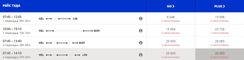 | Finnair (AY 7053) Airbus А320 | 08:55 Хельсинки (HEL) | 3 ч. 00 мин | 10:55 Милан (MXP) | 6 апреля |