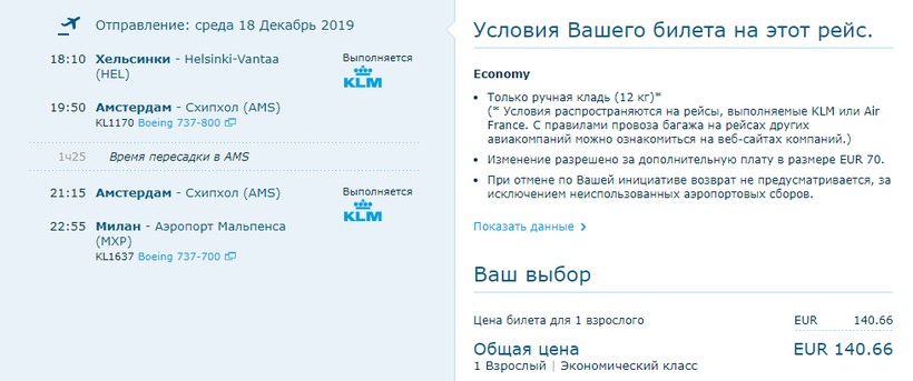 | Finnair (AY 1779) Airbus А320 | 16:25 Хельсинки (HEL) | 3 ч. 05 мин | 18:30 Милан (LIN) | 25 октября |