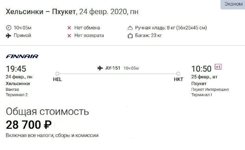 Finnair (AY 151) Airbus A350-900 | 16:35 Хельсинки (HEL) | 11 ч. 25 мин | 09:00 Остров Пхукет (HKT) | 1, 8, 15, 22, 28, 29, 30 ноября, 1, 2, 3, 5, 6, 7, 8, 9, 10, 12, 13, 14, 15 декабря, … |