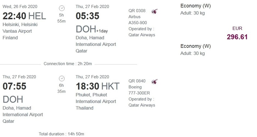 В «высокий» сезон лучше выбрать полет с Finnair — без пересадок, в Таиланд прилетите днем, условия на борту комфортные. Тем, кому не подходит дата вылета или цена перелета не по карману, советую обратить внимание на предложение Qatar Airways. У этой авиакомпании очень разумные цены, большие нормы провоза вещей, бесплатный выбор мест в салоне плюс гибкое расписание.