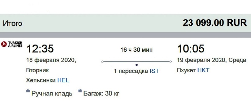 Turkish Airlines. Крупный турецкий перевозчик летит в Таиланд через Стамбул (аэропорт Стамбул). В «высокий» сезон перелеты выполняются ежедневно (2 рейса в день). А с апреля по октябрь самолеты летают через день. Пересадка длится минимум 3,5 часа. Всего за 2–3 дня до вылета можно купить максимально дешевый билет за 23000 ₽. В салоне позволено везти дорожную сумку весом 8 кг, а в багаж сдать до 30 кг вещей.