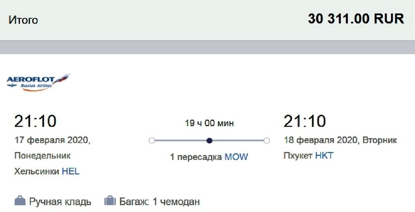 «Аэрофлот». Российская авиакомпания совершает рейсы на Пхукет круглый год, иногда самостоятельно, а иногда совместно с финскими перевозчиками Nordic Regional Airlines или Finnair. Летают авиалайнеры весь год, по 5–9 раз за день. Хаб стыковки — московский Шереметьево. Самый непродолжительный полет занимает 16 часов, это считая стыковку в 5 часов. Перелет по тарифу «Эконом Бюджет» стоит от 30000 ₽. В тариф включены ручная кладь в 10 кг и вещи до 23 кг.