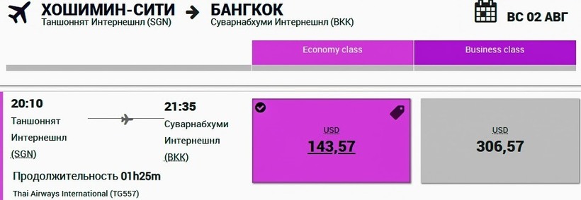 | Thai (TG 557) Airbus А320 | 20:10 Хошимин (SGN) | 1 ч. 25 мин | 21:35 Бангкок (BKK) | ежедневно по 27.03, кроме 05.11, 06.11 |