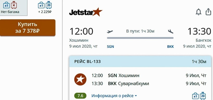 Лайнеры Jetstar Pacific летают с апреля по конец октября по два раза в день. Полет с этим авиаоператором рекомендую в исключительных случаях, так как билеты у Jetstar не самые дешевые: только туда стоят от 7500 ₽, в обе стороны — от 15500 ₽ (с ручной кладью — от 5000 ₽ и 10000 ₽ соответственно).