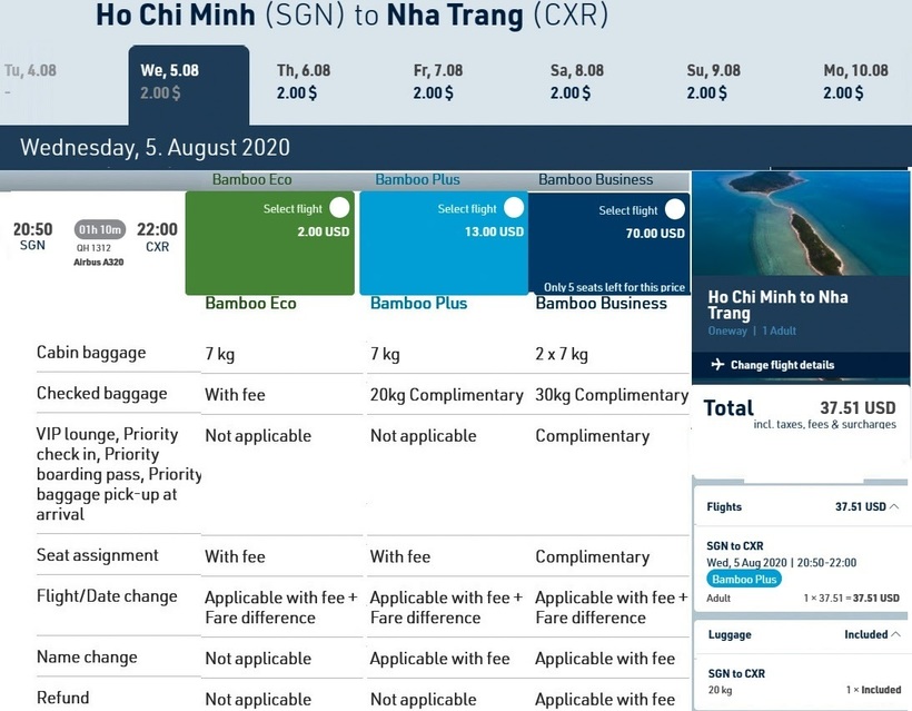 У Bamboo Airways расписание авиарейсов не самое разнообразное — самолеты летают всего по одному разу в день (вылет дневной или вечерний). Путешествие с данным лоукостером также могу отнести к недорогим: только туда с багажом обойдется от 2800 ₽ (38 $), в обе стороны — от 5400 ₽ (73 $). Авиаперелет с ручной кладью стоит от 1900 ₽ (26 $) и 3900 ₽ (53 $) соответственно. У этой бюджетной компании доступен полет и в бизнес-классе, куда авиабилет можно купить всего за 5200 ₽ (70 $).