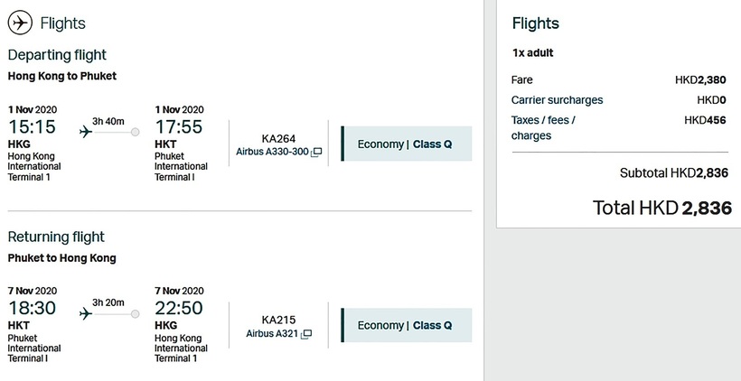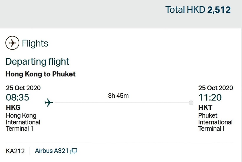 Cathay Pacific (CX 787) Airbus A320 | 08:30 Гонконг (HKG) | 3 ч. 50 мин | 11:20 Остров Пхукет (HKT) | 26, 27, 29, 31 октября, 3, 5, 10, 11, 12, 14, 16, 19, 21, 24, 25, 26, 28 ноября, 1, 2, 3 декабря, … |