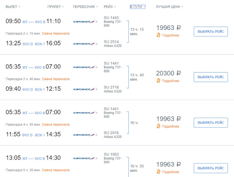 Я предпочитаю выбирать утренние вылеты, потому что тогда можно добраться до Барселоны за 13 часов, два из которых уйдут на пересадку в Шереметьево. Считаю очень удобным то, что ее обеспечивает сам перевозчик, не нужно заново регистрироваться и сдавать/получать багаж, я просто перехожу с борта одного самолета на другой. При этом нужно будет сменить терминал.