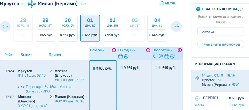 Желая сэкономить, я просмотрела цены на полгода вперед, и могу сказать, что нет смысла покупать билеты заранее, ведь у перевозчика отсутствует динамическое ценообразование. Зато гораздо выгоднее заплатить за перелет туда и в обратном направлении. Например, мне он обошелся в 29000 рублей!