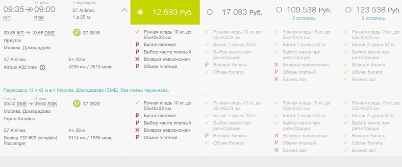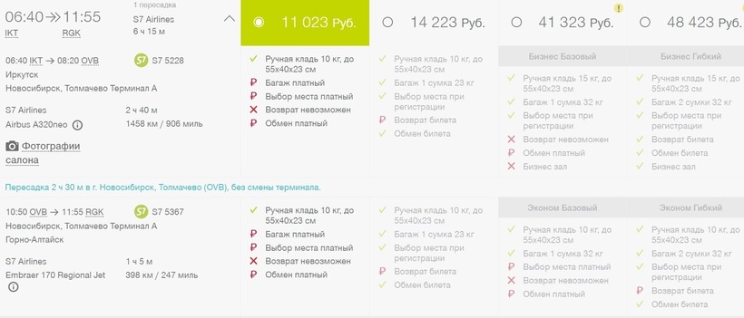 Авиапутешествие из Иркутска в Горно-Алтайск можно совершить с S7 — это один из крупнейших российских перевозчиков. Но это не прямые рейсы, их просто нет. Можно лететь через Новосибирск, например. В дороге проведете сутки, 18 ч. или 6,5 ч. (все зависит от конкретного рейса и дня недели, расписание нестабильное и периодически меняется). Перелет через данный город доступен только два раза в неделю. Билеты за месяц — от 11000 рублей. Стыковки проходят в аэропорту Толмачёво (крупная воздушная гавань с хорошо отлаженной инфраструктурой). Удобнее всего выбрать рейс, который длится всего 6,5 ч., тогда на пересадку уйдет 2,5 ч. Это максимально быстрый способ добраться из Иркутска до Горно-Алтайска. Если багажа с собой нет, то рекомендую тариф «Эконом Базовый», в его стоимость включена перевозка только ручной клади весом до 10 кг (купить билеты можно за 11000 рублей).