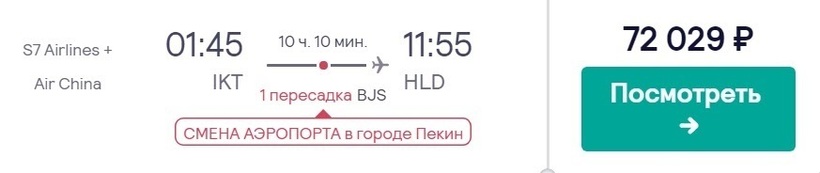 У этих компаний есть и более дешевый вариант. Правда, он долгий. Дорога займет почти 1,5 суток. Придется сделать две пересадки: в Новосибирске (аэропорт Толмачево) — 18 ч. и Чите — 7,5 ч. Цена билета только туда — 28500 рублей (за три месяца). Цена обратного билета примерно такая же.