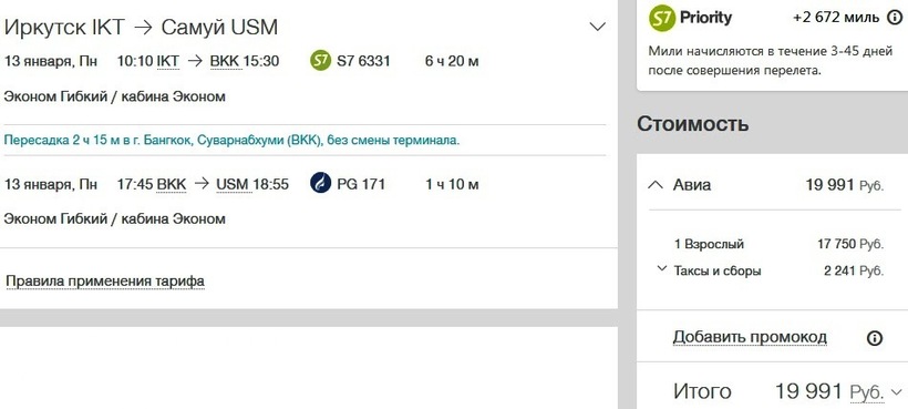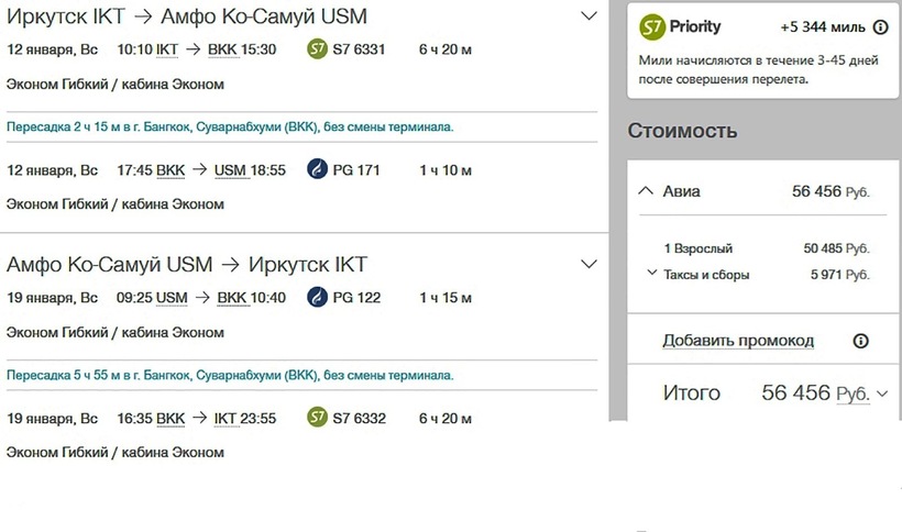 Авиалайнеры российской авиакомпании S7 летают на Самуи ежедневно, от 10 до 25 раз в день. Чаще всего со стыковкой в Бангкоке. Хотя есть транзит через Гонконг по средам и субботам (дважды в сутки). Или можно лететь с пересадкой в Пхукете по понедельникам и четвергам (4–5 рейсов в день). Но я предпочитаю перелет через Бангкок (авиахаб Суварнабхуми) — у него самое удобное расписание. С декабря по март полеты совершаются во все дни недели. На протяжении суток в Таиланд летит 15–20 самолетов перевозчика. Самое короткое авиапутешествие занимает приблизительно 10 часов. Вторую часть авиаперелета (от Бангкока) совершает компания Bangkok Airways. Немного о ценах. Самые дешевые билеты в высокий сезон (с конца декабря по март) стоят от 20000–22000 ₽, если купить их за 2–3 месяца.
