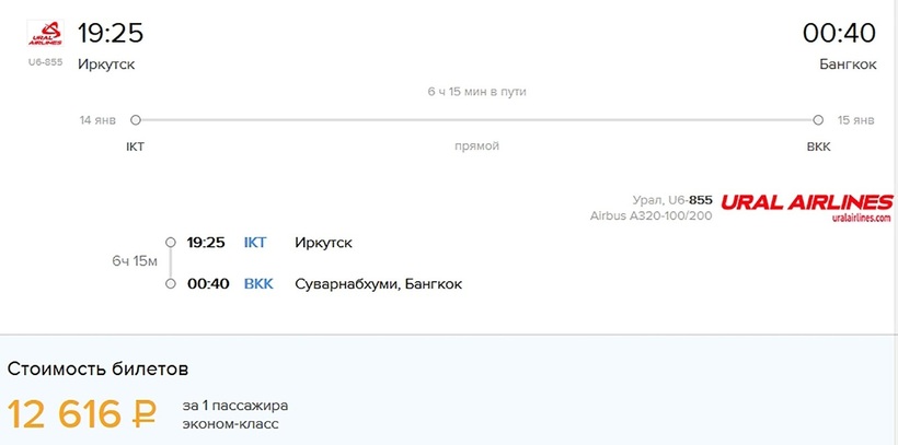 С декабря 2019 года появилась возможность добраться из Иркутска в Таиланд с «Уральскими авиалиниями». Самолеты авиаперевозчика летают в Бангкок два раза в неделю (по вторникам и четвергам). Рейс прямой, продолжительностью примерно 6 часов. В столице Таиланда нужно пересесть на лайнер Bangkok Airways и лететь еще час. Авиапутешествие с «Уральскими авиалиниями» (багаж до 10 кг) обойдется в 12600 ₽ (при бронировании за 2 месяца).