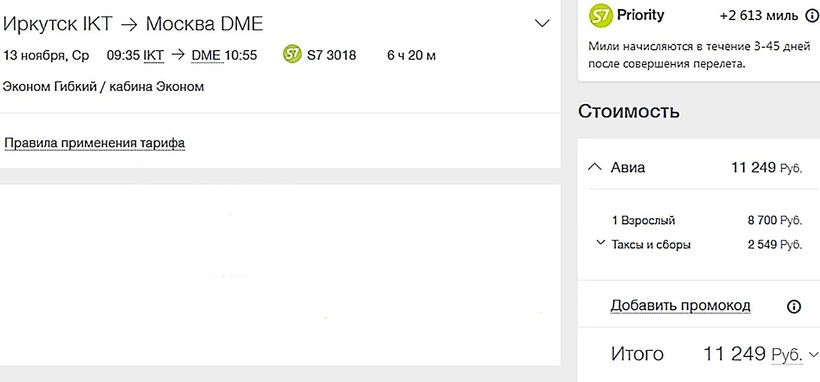 | S7 Airlines (S7 3020) Airbus A320 NEO | 06:55 Иркутск (IKT) | 6 ч. 10 мин | 08:05 Москва (DME) | 26 октября |