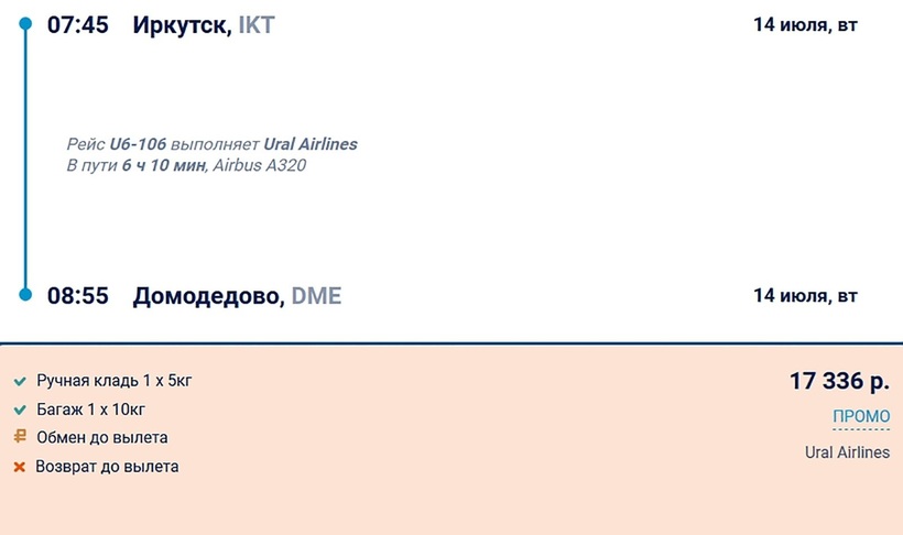 «Уральские авиалинии» предлагают полет по довольно нестандартному тарифу — «Промо». Он, кроме ручной клади на 5 кг, включает еще 10 кг багажа. В высокий сезон такое авиапутешествие обходится всего в 17000 ₽, при раннем бронировании (за 8–10 месяцев).