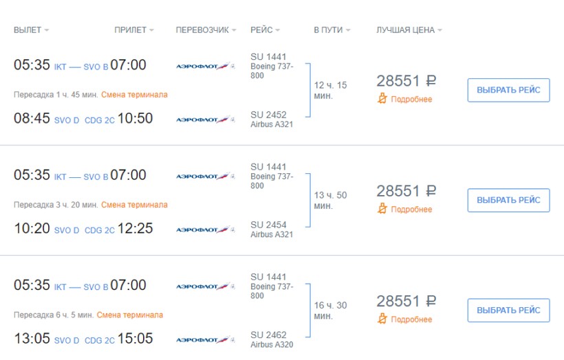 Из Иркутска до французской столицы не предусмотрено ни одного прямого перелета. Зато есть довольно много перевозчиков, которые выполняют транзитные рейсы: