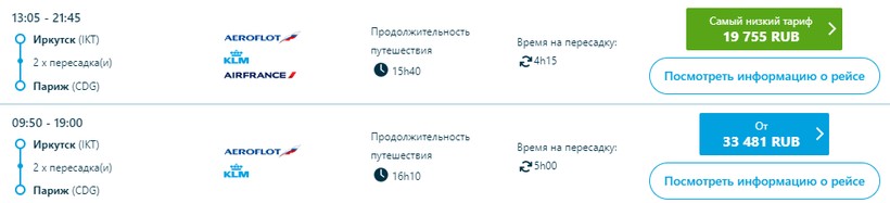 Данный оператор летает в Париж с двумя пересадками, в его расписании предусмотрено довольно много рейсов, большинство из которых выполняются совместно с Air France и «Аэрофлотом». Наиболее оптимальным вариантом я считаю тот, что долетает за 15 часов, совершая стыковки в Москве и в Амстердаме. Несмотря на то, что летает несколько перевозчиков, билет приобретается один, благодаря которому не нужно будет совершать заново регистрационные действия.