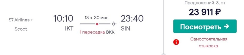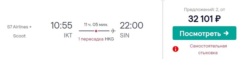 Один из самых быстрых способов попасть в Сингапур — лететь с S7 Airlines и Scoot (сингапурский лоукостер) через Гонконг (прямых рейсов нет). Общее время в пути — 11 ч. На стыковку в аэропорту Чхеклапкок дается 2 ч. У а/к нет договоренности о пересадке — поэтому предстоит самостоятельная стыковка (нужно забрать и сдать багаж, и заново зарегистрироваться на следующий рейс). Билеты накануне вылета — от 32100 рублей. Если забронируете за 4 месяца — они обойдутся примерно в 1,5 раза дешевле.