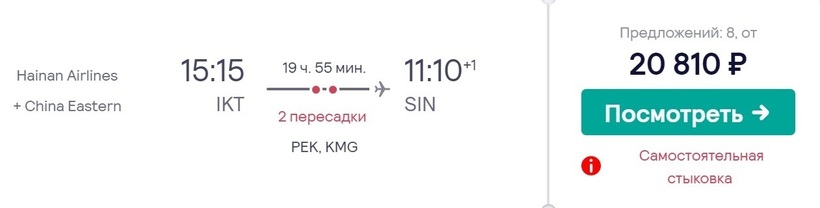 Билеты «туда-обратно» в ноябре обойдутся вам всего в 48 130 рублей, а в июле придется заплатить за них не менее 77 043 рубля. В среднем же, долететь до Сингапура и вернуться в Иркутск можно за 57 242 рубля.