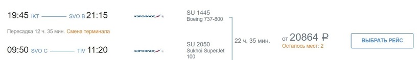 Беспересадочные рейсы в этот черногорский город из Иркутска не выполняются. Расскажу про самые актуальные транзитные варианты. Долететь в Тиват через Москву можно с «Аэрофлотом». Хочу отметить, что у авиакомпании стабильное и удобное расписание. Четыре варианта перелетов со стыковкой в Шереметьево доступно в ежедневном режиме. Вылеты есть в разное время суток: утром, днем, вечером. В дороге проведете от 12,5 ч. до практически 1,5 суток.