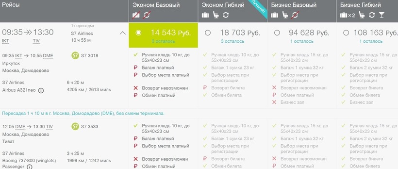 Ценовая политика у перевозчика относительно стабильная. Билет только туда за неделю до вылета купите за 20800 рублей. Это минимальная стоимость, даже если бронировать за несколько месяцев. Никогда не откладываю покупку билетов, путешествуя с «Аэрофлотом» — накануне вылета эта цена может быть выше в три раза. Перевозчик повышает цены и в праздничные цены (в 1,5–3 раза). Самый дешевый тариф у а/к для этого маршрута называется «Лайт». Его советую брать в том случае, если летите в Тиват ненадолго (включена только ручная кладь). Также нужно быть уверенным, что поездка состоится. Билет невозвратный. Более бюджетный перелет есть у S7. Лайнеры авиакомпании доставят до конечного пункта за 11 часов (стыковка в Домодедово), за билеты заплатите 14500 рублей (за неделю до вылета). Столько стоит билет в экономкласс (тариф «Базовый»). Его опции: