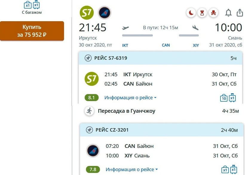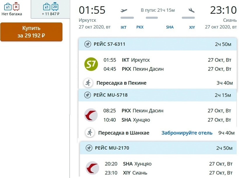 Полеты по маршруту с двумя и более пересадками могу посоветовать лишь в исключительных случаях (например, когда рейсы с одной стыковкой не выполняются), потому что такие варианты авиаперелетов обычно не дешевле, чем путешествия с вышеописанными операторами. Например, преодолеть расстояние за 21 ч. (включая стыковки в 3,5 ч. в Пекине и 10 ч. в Шанхае) можно с S7 и China Eastern Airlines, авиабилет с ручной кладью обойдется от 29000 ₽, с багажом — от 41000 ₽.