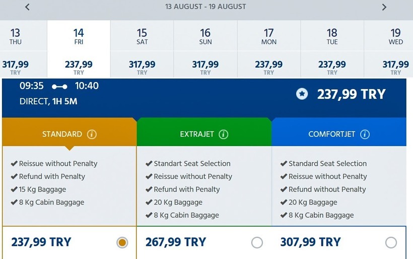AnadoluJet совершает по семь-восемь рейсов каждый день. Несмотря на то, что это бюджетный авиаоператор, билеты на ближайшие вылеты у него не из дешевых (если сравнивать с вышеописанной компанией): в одну сторону обойдутся с багажом в 2500–3400 ₽ (238–318 TRY), туда-обратно — от 5000 ₽ (480 TRY). Могу рекомендовать у AnadoluJet бронировать авиаперелет за 4 месяца до даты отправления, тогда туда путешествие будет стоить от 1600 ₽ (153 лиры), в обе стороны — от 3200 ₽ (305 лир). Бизнес-класса у лоукостера нет.