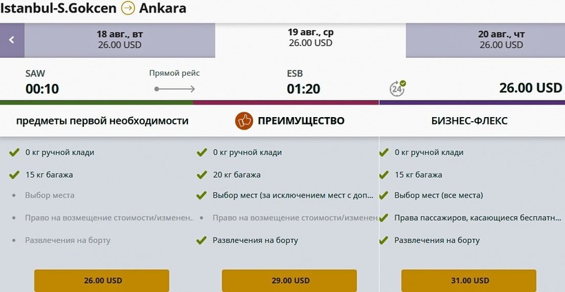 У Pegasus также разнообразное расписание авиарейсов — лайнеры вылетают ежедневно более десяти раз. В ближайшие дни стоимость полетов с Pegasus сопоставима с ценами Turkish Airlines: авиабилет туда с багажом (до 15 кг) можно купить за 1700–2000 ₽ (23–26 $), если забронировать места и на обратный путь, это обойдется от 3700 ₽ (52 $).