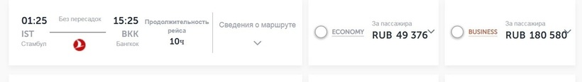 Из Стамбула в Бангкок можно попасть прямым самолетом. Такую возможность предоставляет флагманский перевозчик Турции — а/к Turkish Airlines. Полетное время — 9,5–10 часов. Стоимость билетов только туда за несколько недель до вылета — от 49300 рублей. За 2–4 месяца бронировать порекомендовать не могу — у авиакомпании стабильные цены.