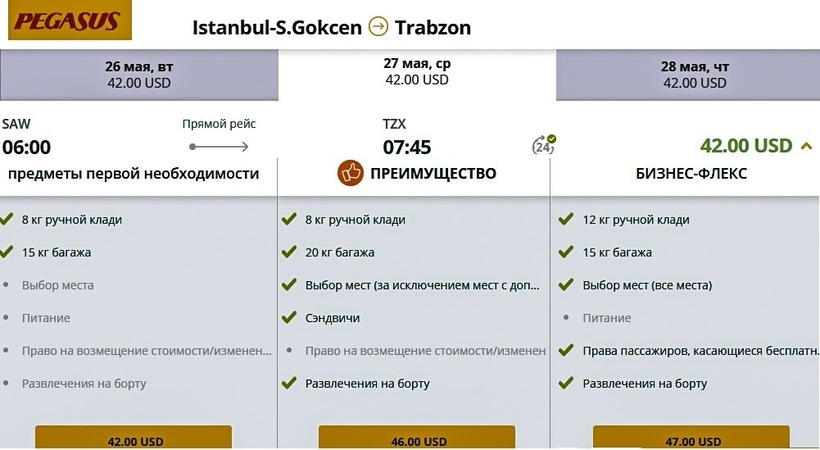 Расписание полетов у всех описанных перевозчиков схожее, и время в пути одинаковое — около 1,5 часа. Поэтому выбирать, с кем лететь, следует исходя из стоимости билетов. В летние месяцы цена перелета у лоукостеров сопоставима. Поскольку я летала по направлению осенью, я предпочла путешествие на крыльях Pegasus, потому что в этот период данный перевозчик предлагал самые недорогие авиабилеты (дешевле, чем у AnadoluJet, на 3500 ₽, и на 1500 ₽, чем у Turkish Airlines). Тем, кто предпочитает летать в бизнес-классе, придется преодолевать маршрут с компанией «Турецкие авиалинии», потому что, напомню, лоукостеры предлагают полет только в классе эконом.