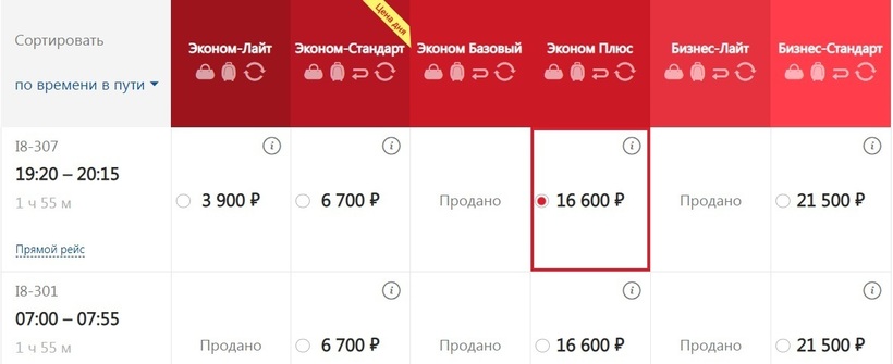Билет за пару дней до вылета самолета приобретете за 3150 рублей (обратный будет стоить столько же). В экономклассе у лоукостера 3 тарифа (бизнеса-класса нет): «Базовый», «Выгодный», «Возвратный».