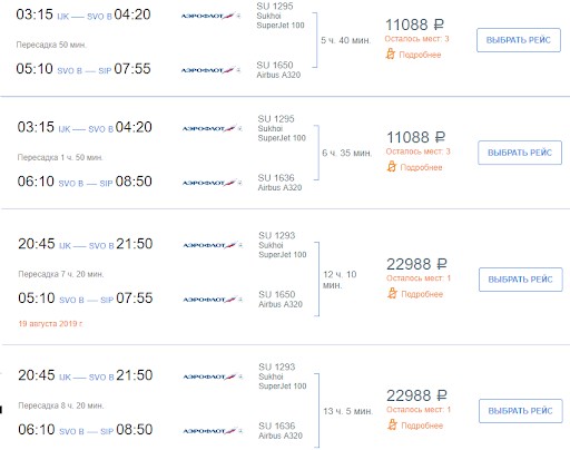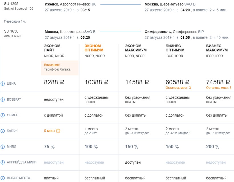 авиабилеты на рейсы с пересадками дешевле, чем на прямые (напомню, от 11400 ₽ у «Ижавиа» против 10500 ₽ у «Аэрофлота» с багажом);
