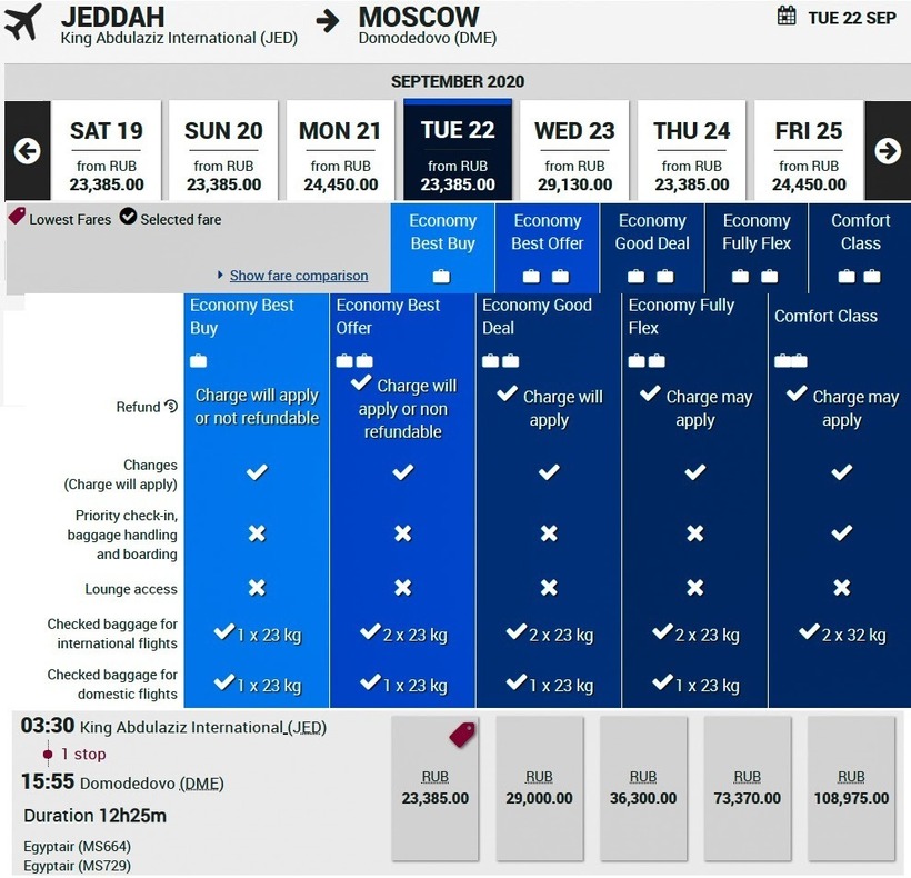 Если сравнивать стоимость перелета в разных авиакомпаниях, то самые дешевые билеты будут у а/к Саудиa – от 15 632 рублей. А вот у а/к Флайдубай цены начинаются от 30 222 рублей.