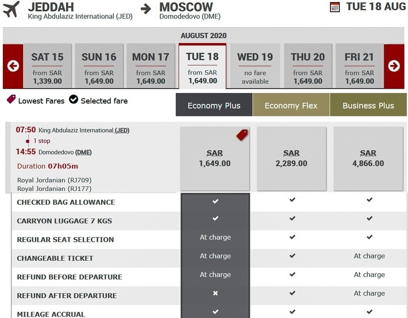 С Royal Jordanian с апреля по октябрь можно преодолеть путь по вторникам, пятницам и воскресеньям, в осенне-зимний период лайнеры летают только по пятницам и воскресеньям. Включая пересадку в Аммане в 1–3,5 ч., авиаперелет занимает 7–10 ч. Билеты у компании недорогие: по минимальному тарифу с багажом туда стоят от 31500 ₽ (1650 риялов), если оформить полет и в обратную сторону, это обойдется от 55500 ₽ (2900 SAR). Бизнес-класс — от 92500 ₽ (4865 SAR).