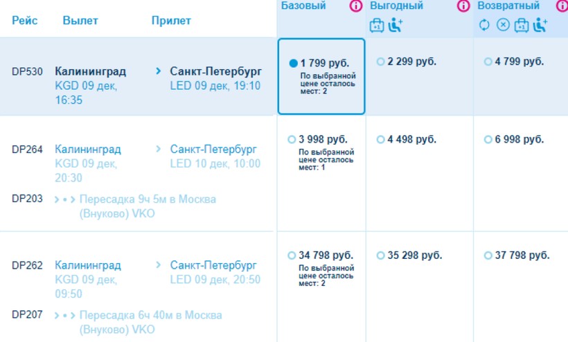 Победа (DP 530) Boeing 737-800 | 09:40 Калининград (KGD) | 1 ч. 55 мин | 12:35 Санкт-Петербург (LED) | 26, 27, 28, 29, 30 октября, 1, 2, 3, 4, 5, 6, 7, 8, 9, 10, 11, 12, 13, 14, 15 ноября, … |