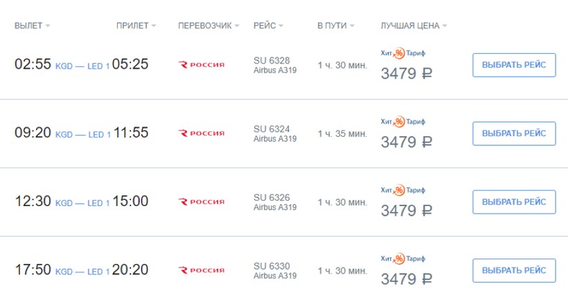 Россия (FV 6330) Airbus A319 | 17:55 Калининград (KGD) | 1 ч. 45 мин | 20:40 Санкт-Петербург (LED) | 26, 27, 28, 29 октября, 2, 3, 4, 6, 7, 9, 10, 11, 12, 13, 14, 16, 17, 18, 19, 20 ноября, … |