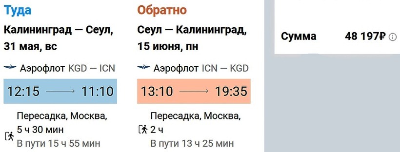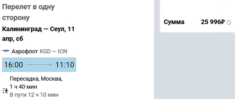 Все перелеты из Калининграда в Сеул транзитные, прямого авиасообщения между городами нет. Общее время путешествия — от 12 часов, включая 1–2 пересадки. «Аэрофлот». Российский флагман предлагает максимально удобное авиапутешествие со стыковкой в Москве (Шереметьево). Часть полетов «Аэрофлот» выполняет самостоятельно, а часть совместно с компанией Korean Air. Вылеты совершаются ежедневно, от 2 до 10 раз за день. Для экономического класса предлагаются 3 тарифа.