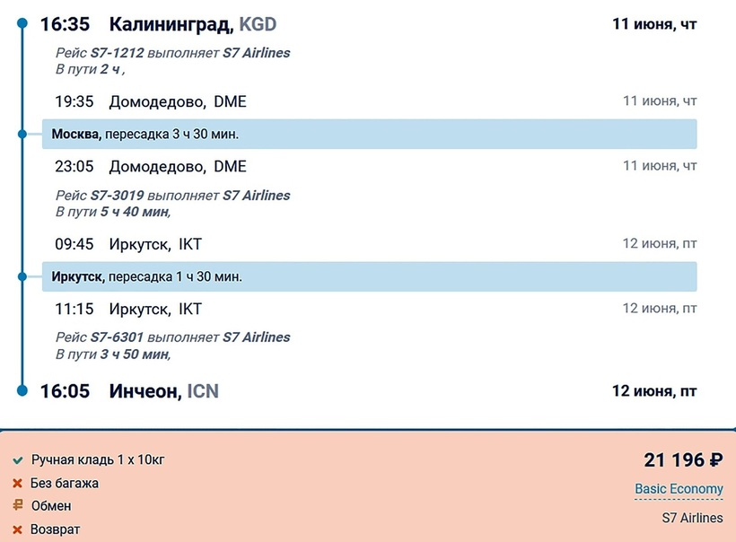 Я считаю предложение «Аэрофлота» лучшим. Во-первых, у компании гибкое расписание. Во-вторых, рейсы, выполняются с одной стыковкой, часто совсем недолгой (2–3 часа). В-третьих, сервис компании всегда приличного уровня — с бесплатной едой и напитками, доступом к розеткам и медиасистеме развлечений. Кроме того, ценовая политика вполне разумная. S7. Еще одна крупная российская авиакомпания, самолеты которой летают в Сеул или через Москву (Домодедово) и Иркутск, или через Москву и Новосибирск (Толмачево). Полеты совершаются 4 раза в неделю, в день может быть от 2 до 10 рейсов. Длительность полета от 16 до 30 часов, в зависимости от стыковок. При бронировании места за 2–3 месяца до вылета, можно найти авиабилет от 21000 ₽.