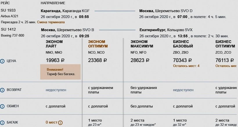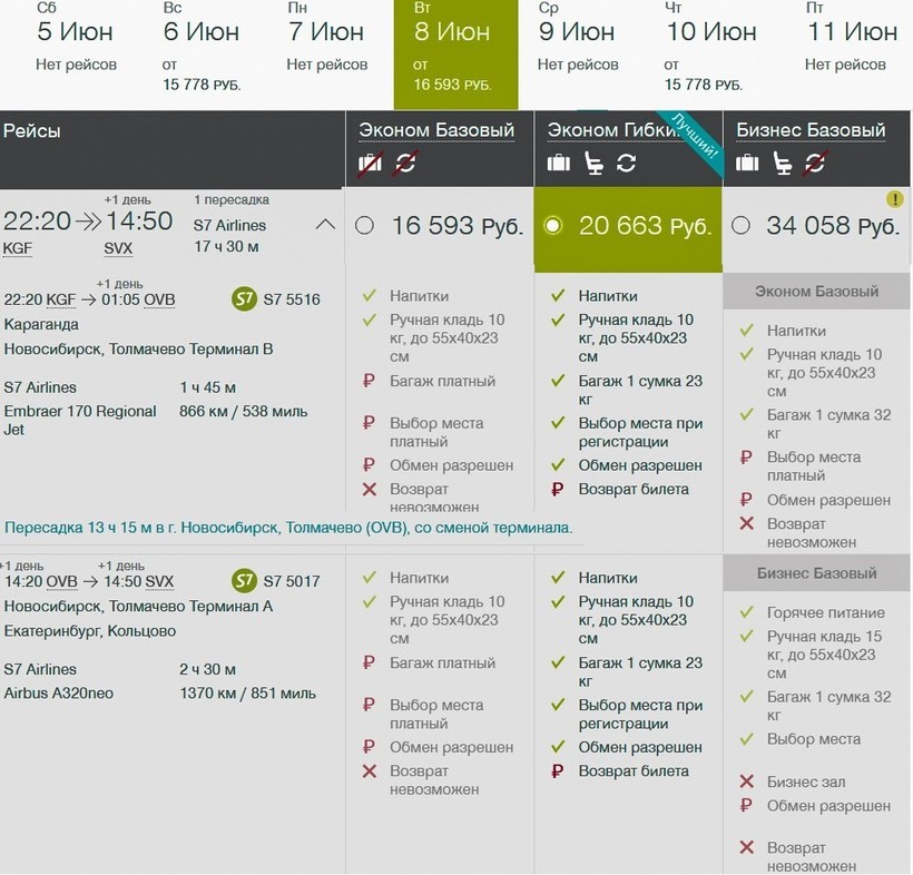 Кроме описанных вариантов перелетов, других способов преодоления пути нет. По маршруту даже не предлагаются рейсы с двумя и более стыковками. В осенне-зимний период лететь по направлению придется с «Аэрофлотом». Но поскольку я преодолевала маршрут в апреле, я предпочла дешевый вариант путешествия — с S7 Airlines. У данного авиаоператора цена билетов туда-обратно с ручной кладью была ниже аэрофлотовской на 7500 ₽. Если сравнивать стоимость авиаперелета с багажом, экономия составит до 3000 ₽. Преодолеть все расстояние в бизнес-классе можно только с «Аэрофлотом» (вне зависимости от сезона), так как, напомню, S7 из Караганды в Новосибирск предлагает полет лишь в классе эконом.