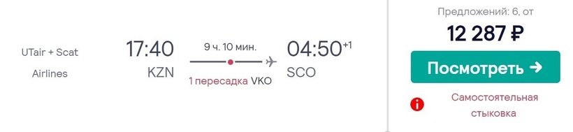 Когда планирую авиапутешествие, для меня важнее всего такие параметры, как время в пути и стоимость билетов. Если сравнивать варианты с комбинациями авиакомпаний и «Аэрофлот», то по второму параметру выигрывает девятичасовой совместный рейс «ЮТэйр» и Scat Airlines. Именно его я и выбрала для перелета в Актау.
