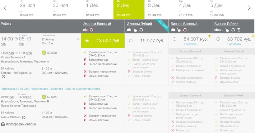 Иногда я выбираю перелет с S7 (если его продолжительность не более 10 ч.), потому что билеты у авиакомпании дешевле, чем у предыдущего оператора. Путешествие с багажом только туда будет стоить от 16000 ₽, если оформить сразу и в обратную сторону — от 31000 ₽. Бизнес-класс перевозчик предлагает только на отрезке пути Новосибирск — Пекин, а до Новосибирска придется лететь в классе эконом. Такой авиабилет обойдется от 55000 ₽.