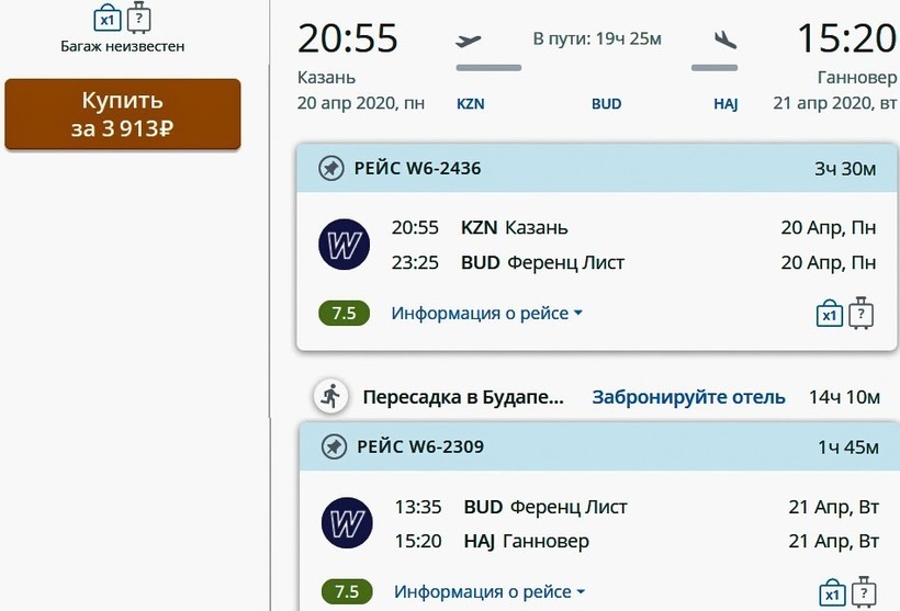 Тем, кто ищет максимально дешевые способы преодоления маршрута, могу рекомендовать полет с лоукостерами с самостоятельной стыковкой. Например, с ноября по май по понедельникам и пятницам, а в остальные месяцы по вторникам, четвергам и субботам долететь до Ганновера можно с бюджетным оператором Wizz Air. Авиаперелет продлится 19,5 часа (с пересадкой в Будапеште в 14 часов), но с ручной кладью обойдется всего от 4000 ₽ (только туда). Кроме того, что такое путешествие занимает довольно много времени, к недостаткам отнесу и то, что стыковка ночная, поэтому придется дополнительно потратиться за гостиницу.