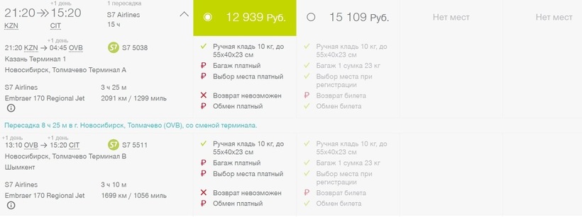 Пассажирам предлагается на выбор два тарифа в экономклассе: «Базовый» и «Гибкий». Первый я беру, если лечу ненадолго, потому что на борт лайнера можно взять только ручную кладь. В стоимость второго тарифа включен багаж, плюс можно бесплатно выбрать место при регистрации. Так как пересадка в воздушной гавани Новосибирска длится целых 8,5 ч., то можете съездить на прогулку в город (например, посмотреть на знаменитый метромост). На дорогу туда-обратно закладывайте примерно 1,5 часа (если добираться на такси). «ЮТэйр» и Scat Airlines предлагают девятичасовой перелет через Москву (Внуково). Стыковка — 2,5 ч. Она самостоятельная, то есть в воздушной гавани пересадки нужно забрать и снова сдать свой багаж, и пройти регистрацию на следующий рейс до Шымкента. За полтора месяца билеты — от 12000 рублей.